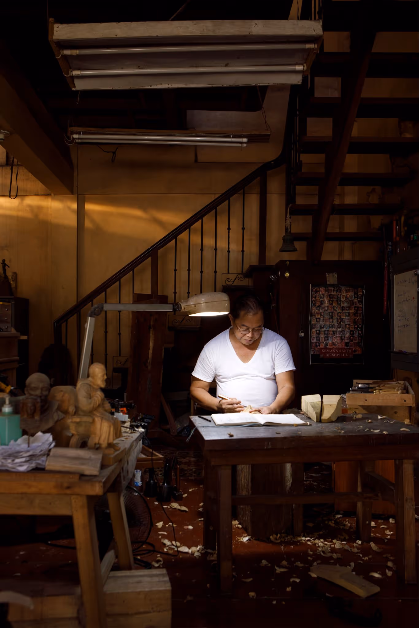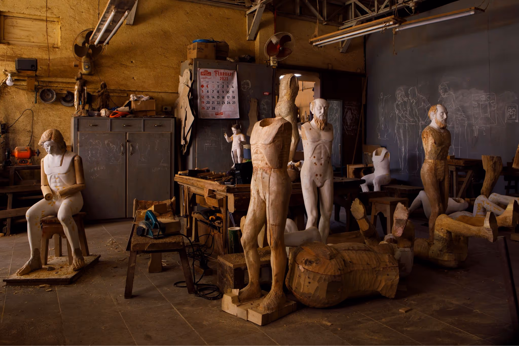 Through the door at Paloy’s left is the entrance to the main workshop, where all his apprentices are at work. The nearest wall is a blackboard where he draws a lifesize scale of the pieces they’re making. At the moment there are images of Jesus scourging at the pillar in chalk — one version facing front and another facing the right, to capture all perspectives of the scene. Paloy and his apprentices will use it as reference throughout the wood carving process.