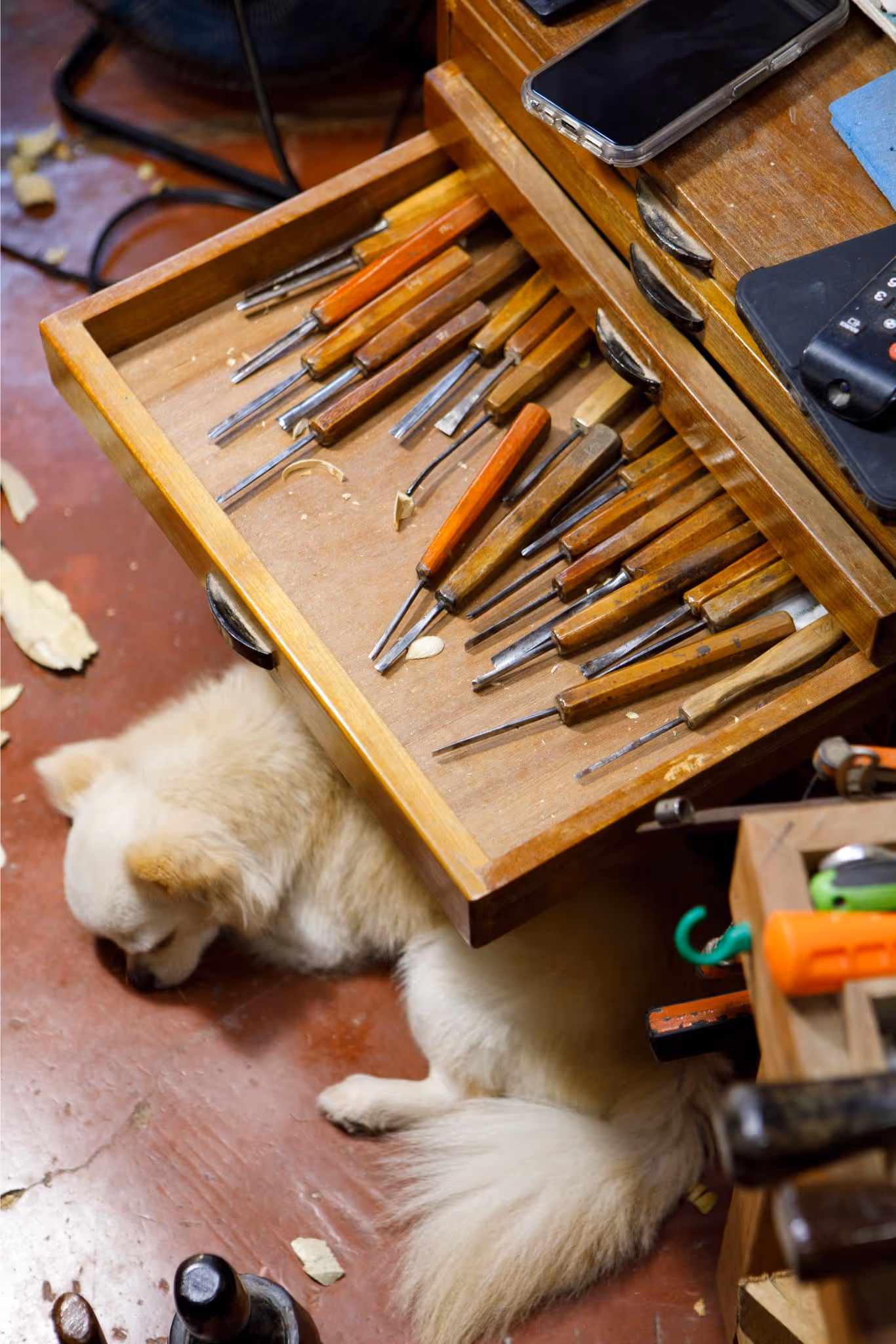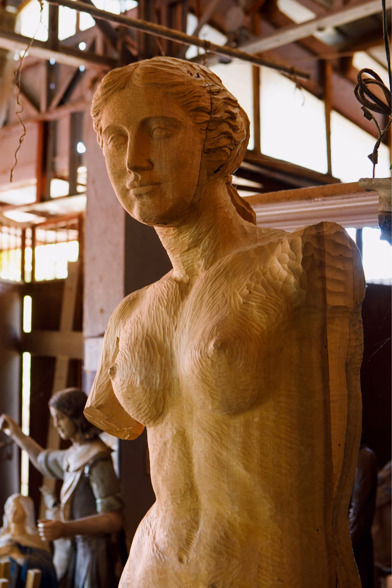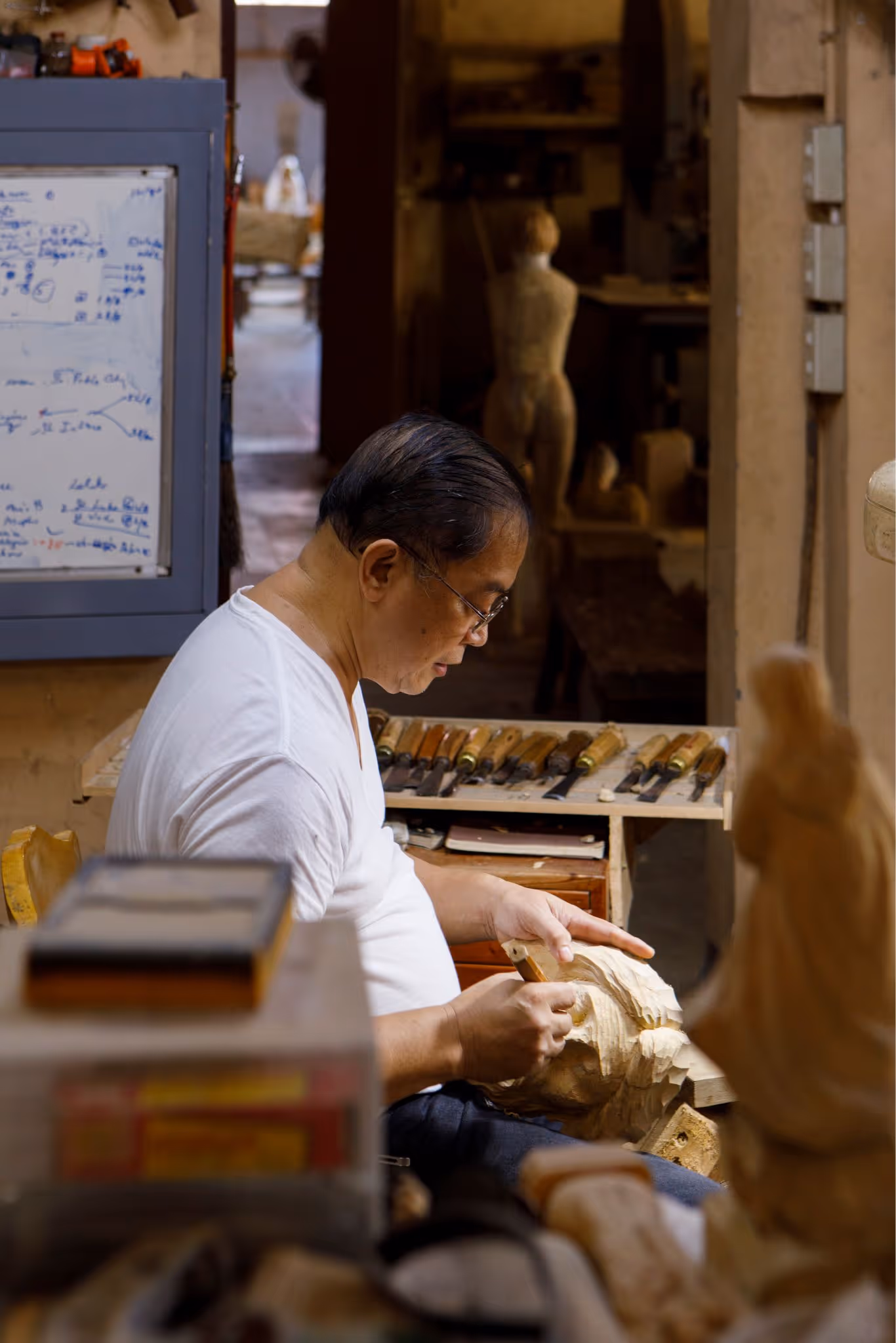 The Stations of the Workshop Touring Paloy’s studio is like walking through stations of the cross. Different stages in the wood carving process are fixed in different areas of the workshop.