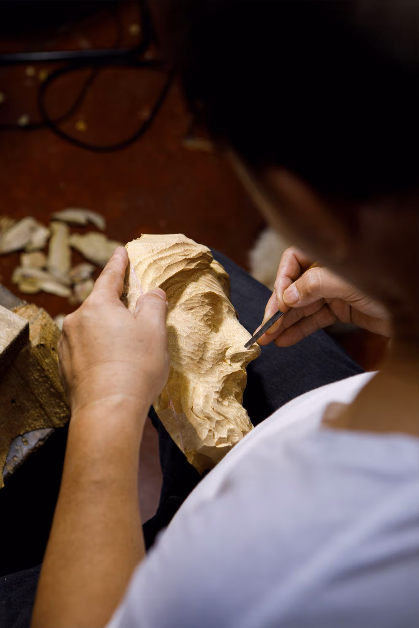Paloy shares all of this without glancing up from his work. In his hands, the block of wood has begun to take shape. The lids of the eyes gain definition while its nostrils almost inhale and flare with new life – almost. But not yet.