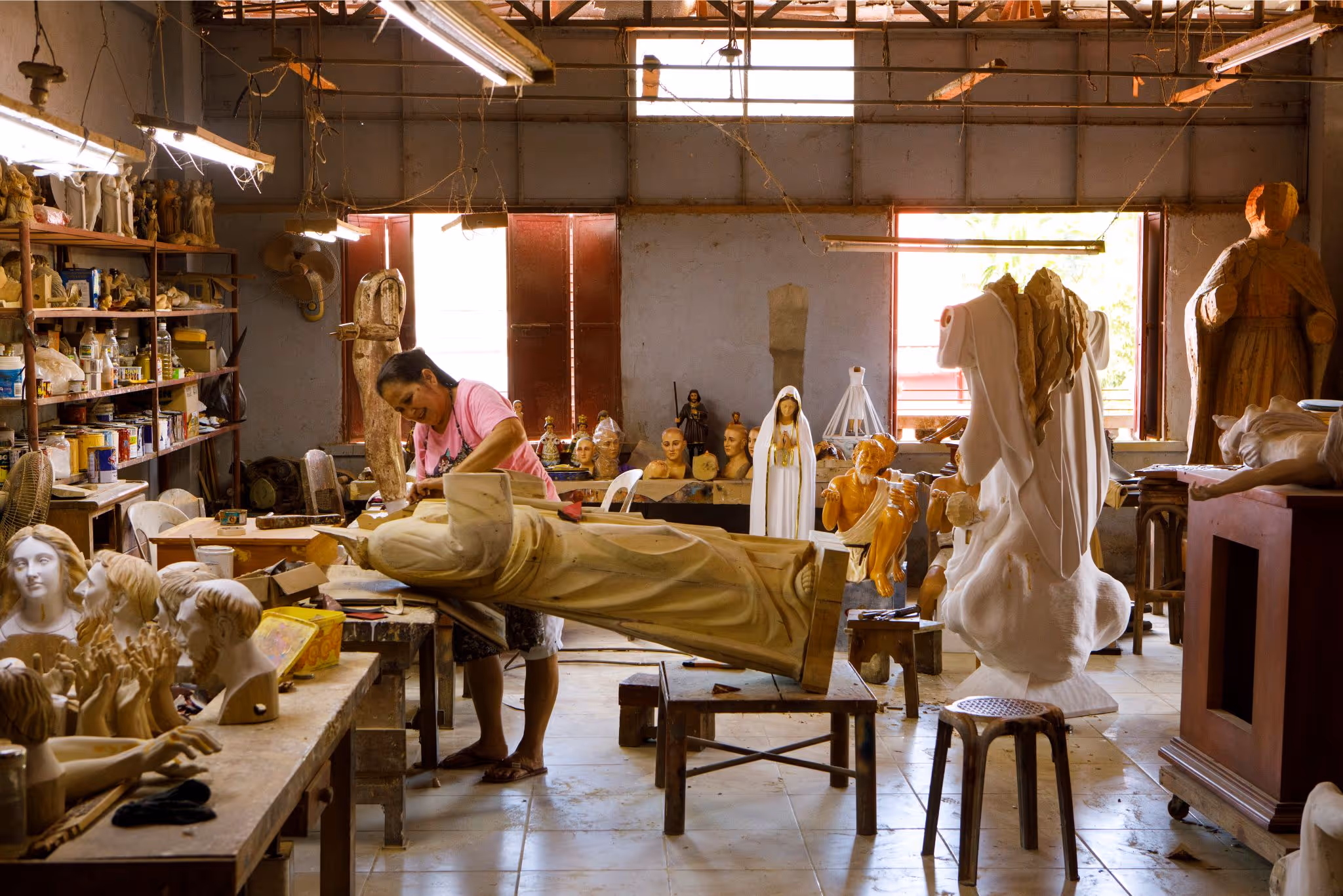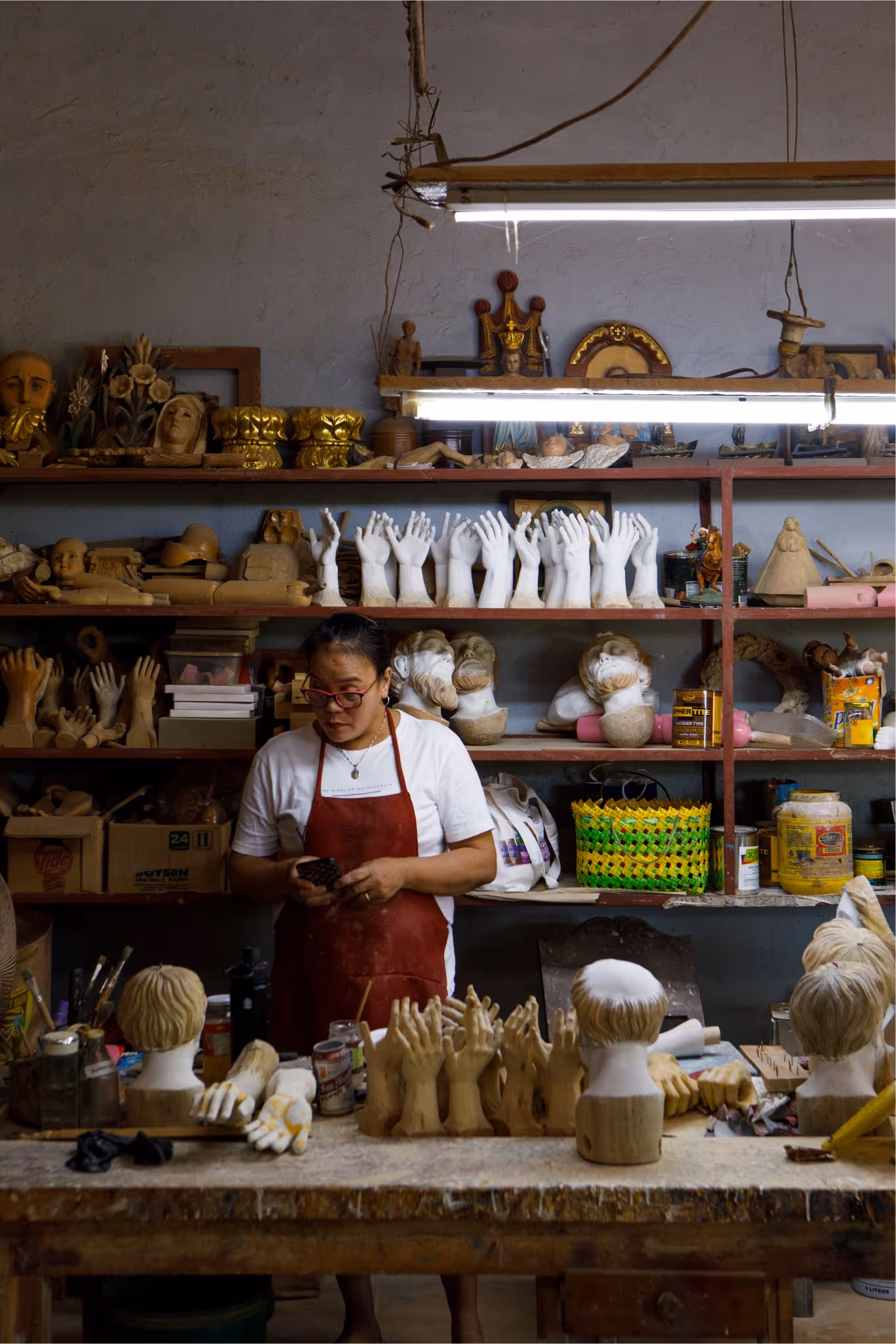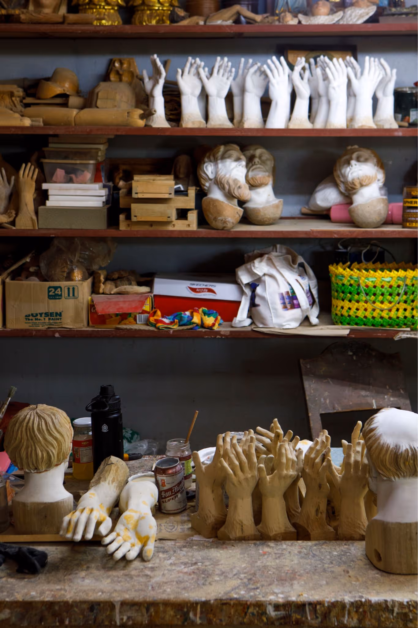 These hands stretch toward the fluorescent lights above, waiting to be joined with the arms of the holy images they belong to. It’s almost sacrilegious how the pieces are simply laid on the table. But it’s just a busy afternoon in the workshop in the days leading up to the Holy Week and the table is proof of the masterful work that happens inside the studio of one of the best artisans in Paete, the wood carving capital of the Philippines.